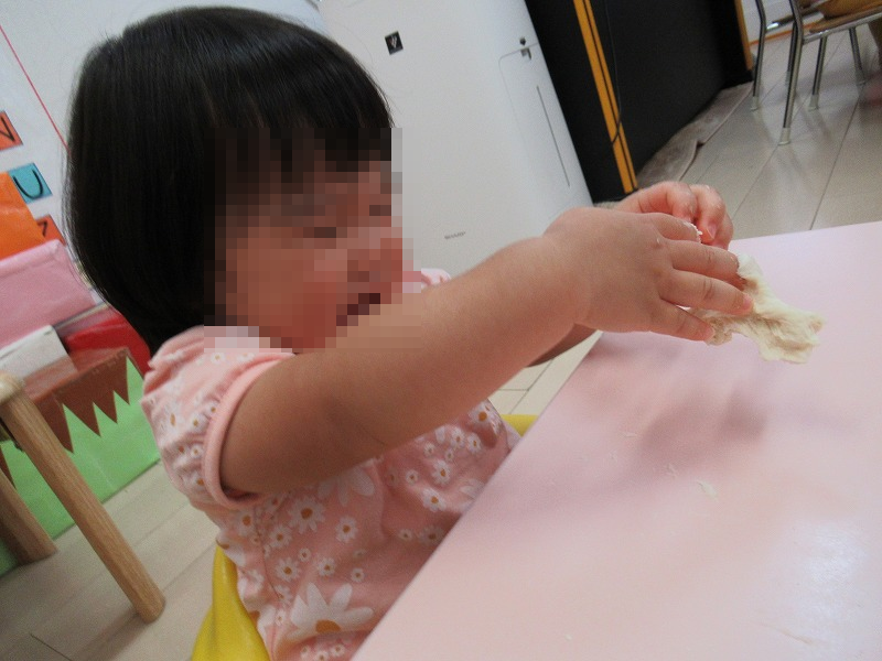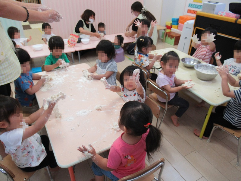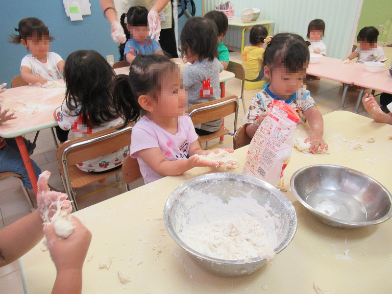 この日は小麦粉粘土遊び。サラサラの小麦粉を触ったり、お水を混ぜて練ってみたり、触感体験をしました。練った小麦粉が指から離れなくて泣き出す子も(笑)。日頃は出来ない遊びは子どもたちのストレス発散にも。楽しかったね(^o^)。