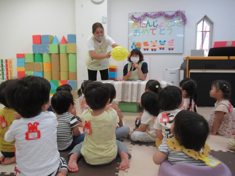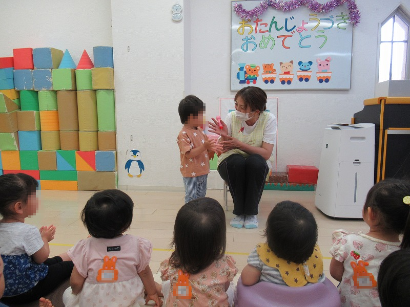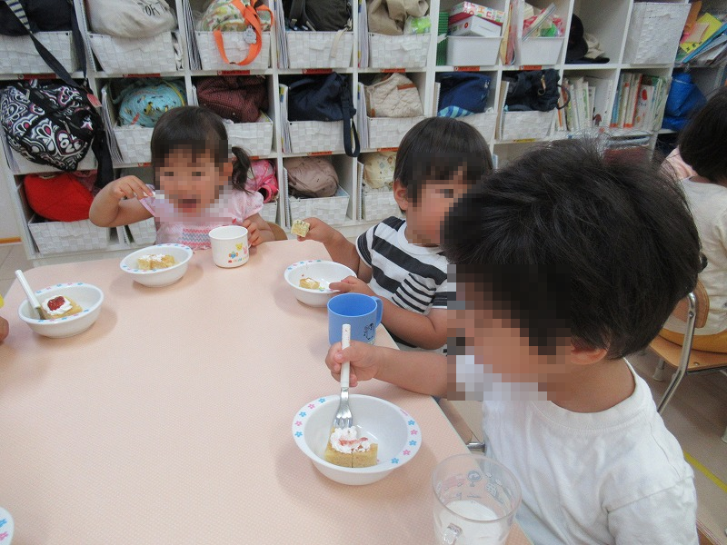 今週は6月生まれのHくんのお誕生月会がありました。先生たちからの楽しい催しの後は、お誕生カードのプレゼント。みんなからお歌のプレゼントをもらったら、手作りケーキ、牛乳でカンパーイ♪