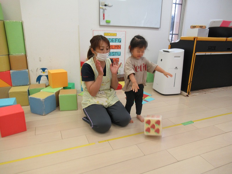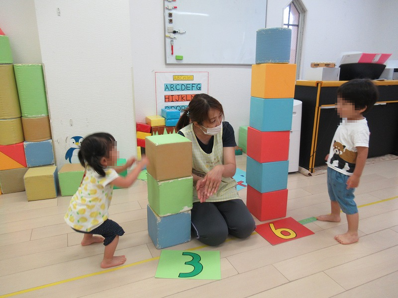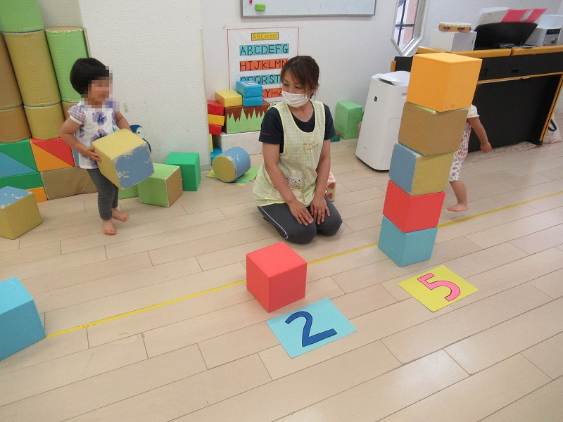 子どもたちの(とくに赤組・2才児)さんの好きな数字遊び(^-^)。今週は「高さ」で数字の概念を学びます。さいころを振ってー♪出た数だけ大型ブロックを積み上げます。