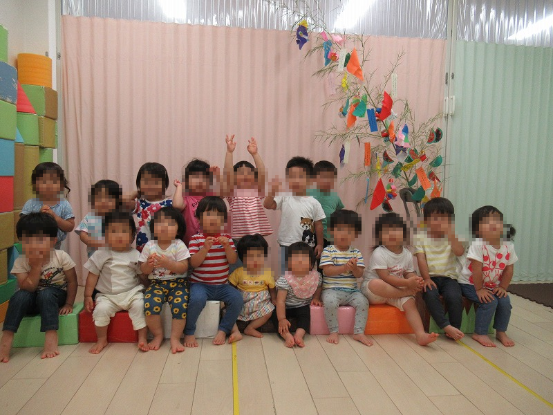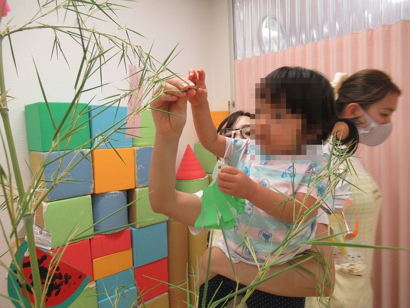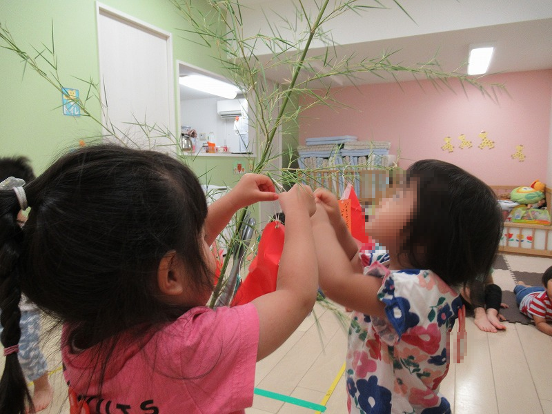 今週は七夕の笹飾りをしました。先生から織姫と彦星のお話を聞いたら、工作の時間に作っておいた短冊や飾りを笹につけていきます。7/7の夜は雨だったけど、雲の上で織姫と彦星はデートをしていると思うよ♪