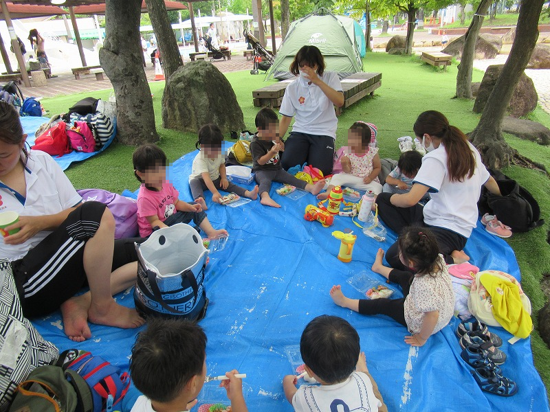 たくさん遊んだら、お腹がペコペコ。給食士さんが早朝から出勤して作ってくれたおにぎりお弁当♪「いただきまーす!」