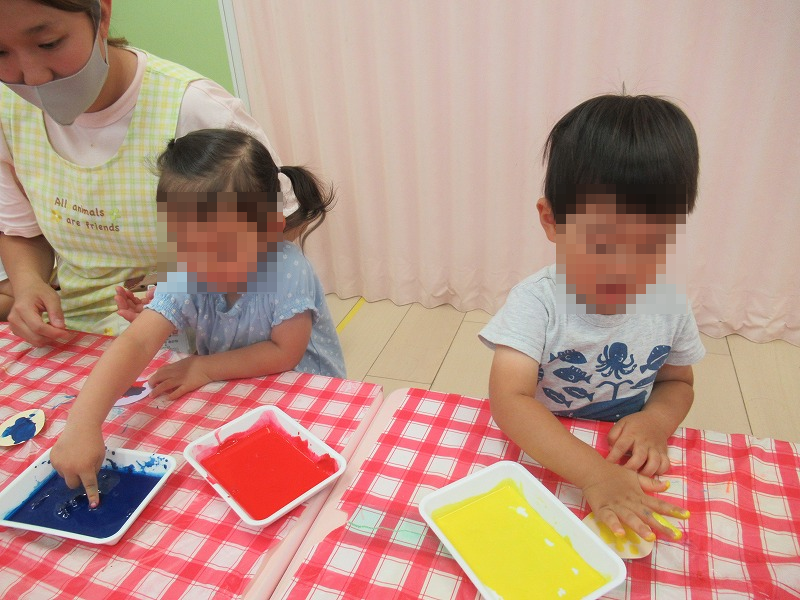 写真は工作の時間。指に絵具をつけて〜♪ペタペタペタペタ♪