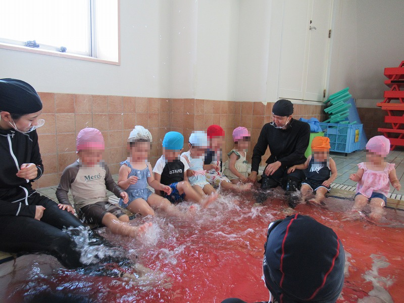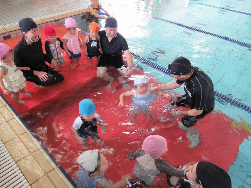 今週から赤組さんのスイミングプログラムが始まりました(^-^)。赤組さん8名に対して先生は5名でのレッスンです。初めての大きなプールに興奮気味の子ども達(笑)。