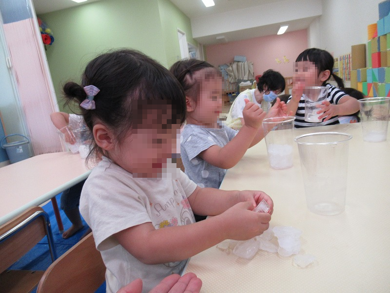 今週も暑い日が続きました。上の写真は今週の触感体験「氷」です。「冷たーい!」「○×△※□〜!」言葉にならない叫びをあげて楽しんでいます(^o^)笑。