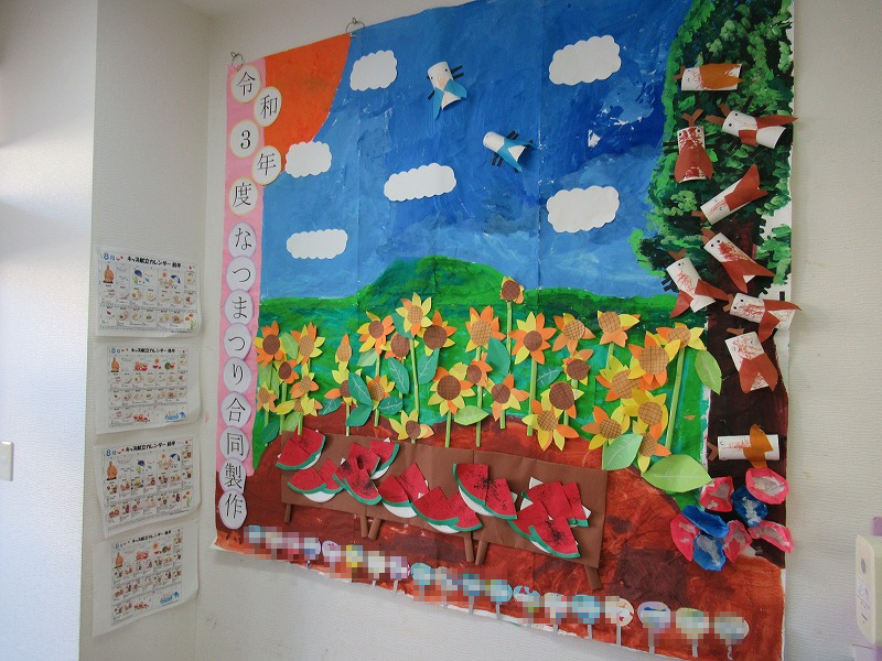 上の写真は毎年恒例・夏祭りのメイン展示物「園児合同製作」です。今年も3週間かけて完成しました。すごく立派な作品ができました(^-^)、みんなーよく頑張ったね(^o^)/。