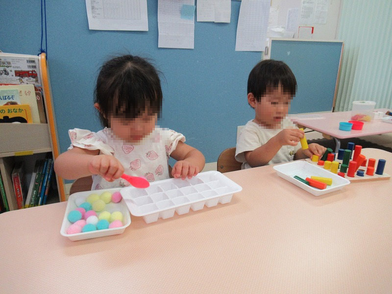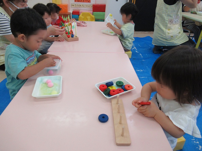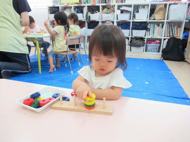 夏季の毎週月曜日の赤組さんはスイミングプログラムで大きなプールへ。園に残ったオレンジ・黄組さんはモンテッソーリ玩具で遊びます。子ども達にはこれがなかなか人気で面白いみたい(^-^)。