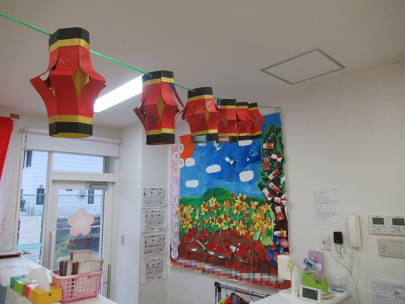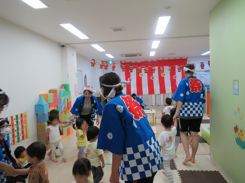 保育室内も夏祭りバージョンです。いつもと違う保育室、祭囃子も「ドンドンカラリピーヒャララー♪」と流れています。お祭りの雰囲気に子ども達も興奮気味(^o^)。