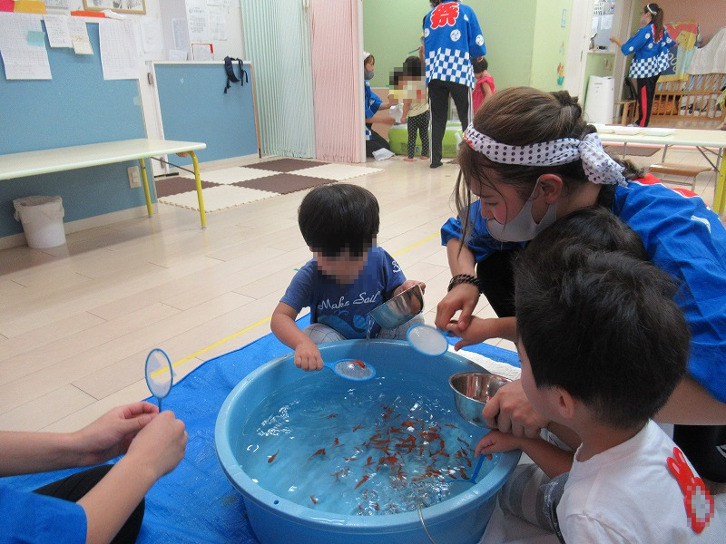 「金魚すくい」も大人気!もちろん本物の金魚を使います。すくった金魚はお持ち帰り(お母さんお父さんごめんなさい!)(^-^;)。