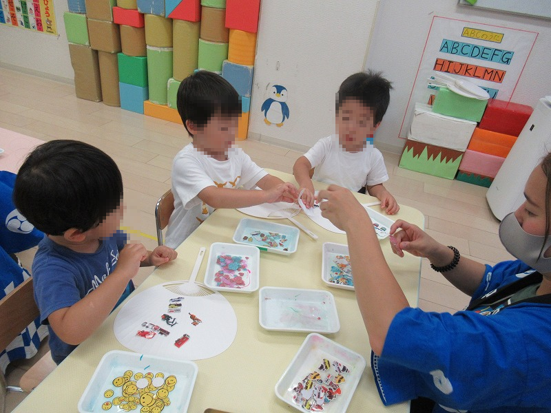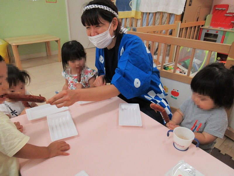 下の写真は「うちわ工作コーナー」と「飲食コーナー」フランクフルトを頬張って「美味しー!」。