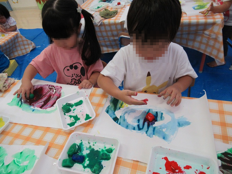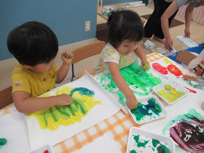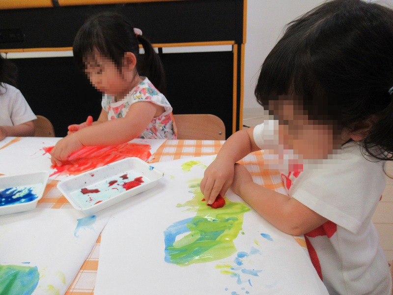 指で直接スポンジを色水につけて模様を描く子ども達。
