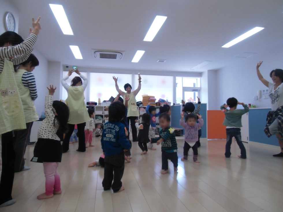 まずは音楽に合わせて自由に体を動かします。(左下写真)クネクネ、ズンチャチャ、ジャンプピョンピョン(^0^)。