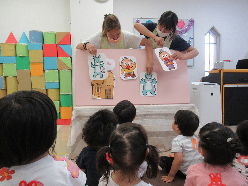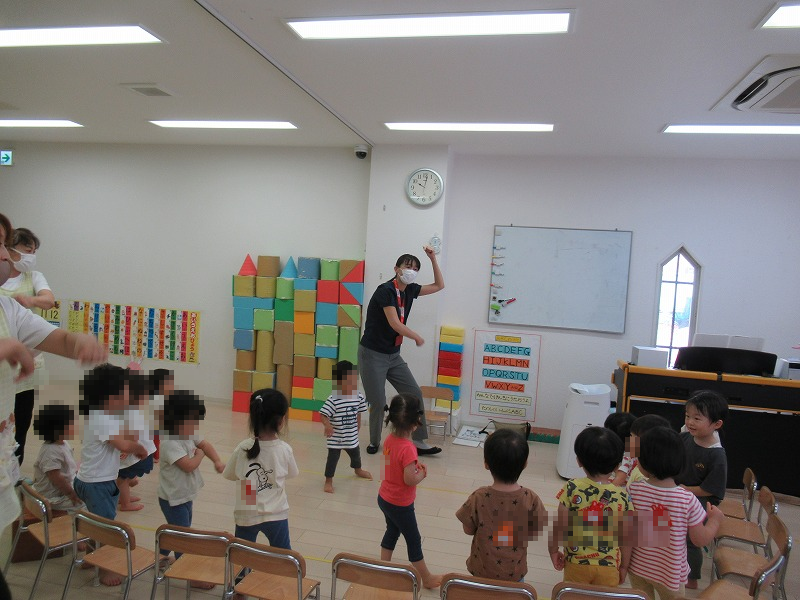 写真は今週のお楽しみ会、ECC英会話、園前ゴムプール♪