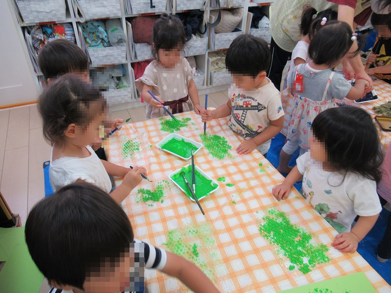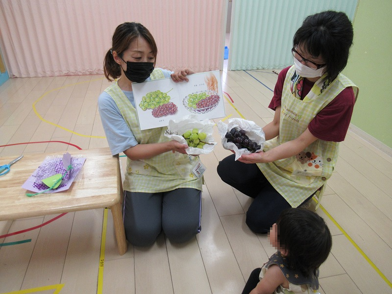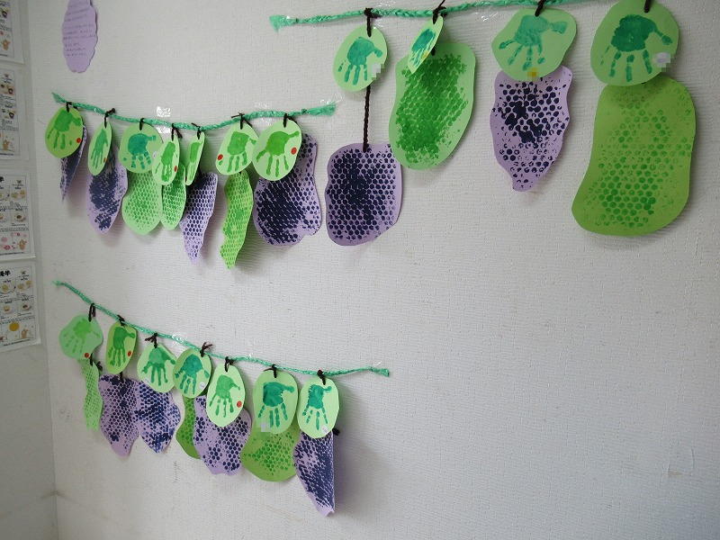 秋の味覚ブドウを版画で作ってみました。先生から本物ブドウを見せてもらったら、工作開始♪工作に取り組んでいる子ども達の表情は真剣そのもの(^-^)。みんないい顔しています。