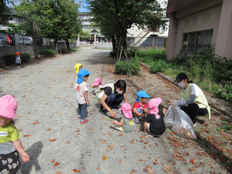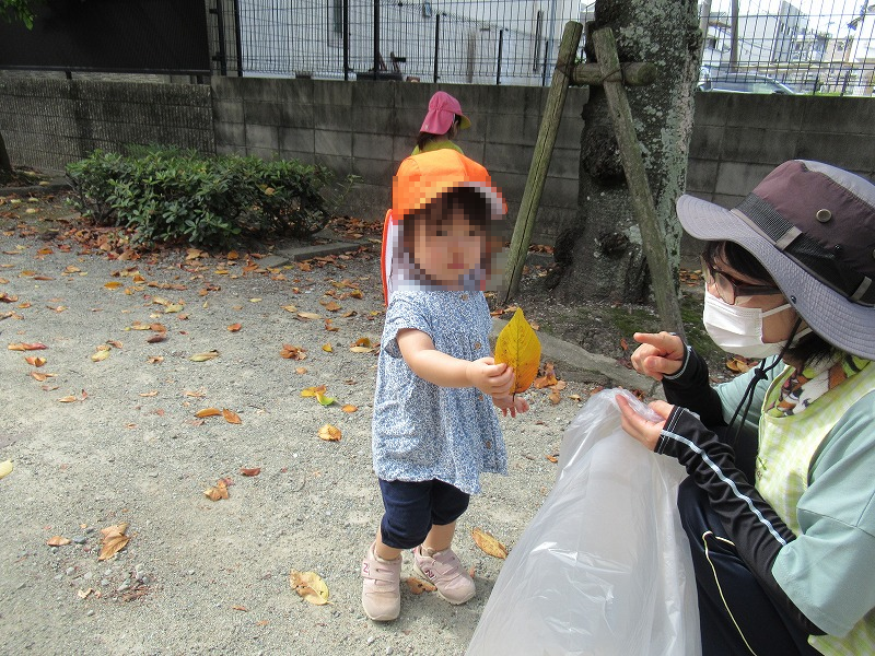 塚口神社参道に落ち葉拾いに行きました。黄色い落ち葉や茶色い落ち葉、大きな落ち葉や可愛い落ち葉。子天使ちゃん達、それぞれ気に入った落ち葉を拾います(^-^)。