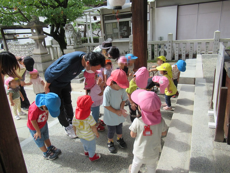落ち葉拾いがすんだら氏神様にご挨拶。「かみさま、こんにちわ」「いつも見守っていただき、ありがとうございます」みんな元気にご挨拶ができました(^-^)♪