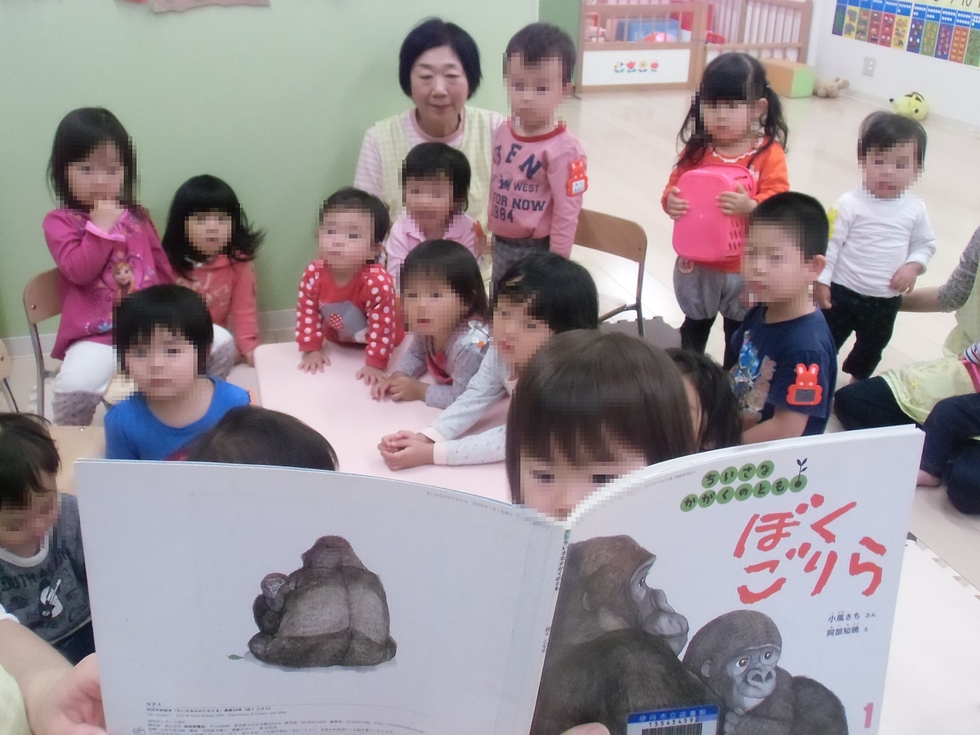 おやつの後は絵本読み聞かせか紙芝居(毎日2話します)。(右下写真)