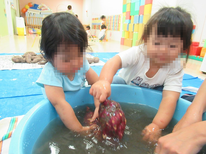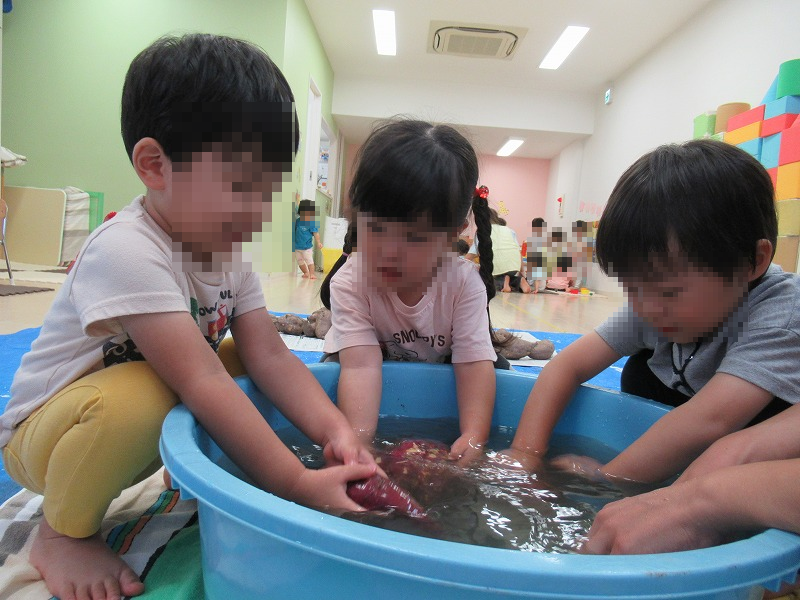 園に帰った子ども達。お芋の土取り洗いを始めます。ちゃぷちゃぷ♪ごしごし♪(^-^)キレイになったお芋を給食士さんに渡します。