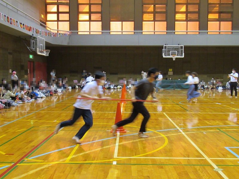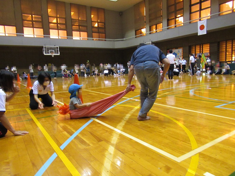 休憩をはさんで後半は親子競技「ぬの船競争」から始まりました。お父さんお母さんとタッグを組んだ子ども達、早い早い!みごと1位に!(^0^)/