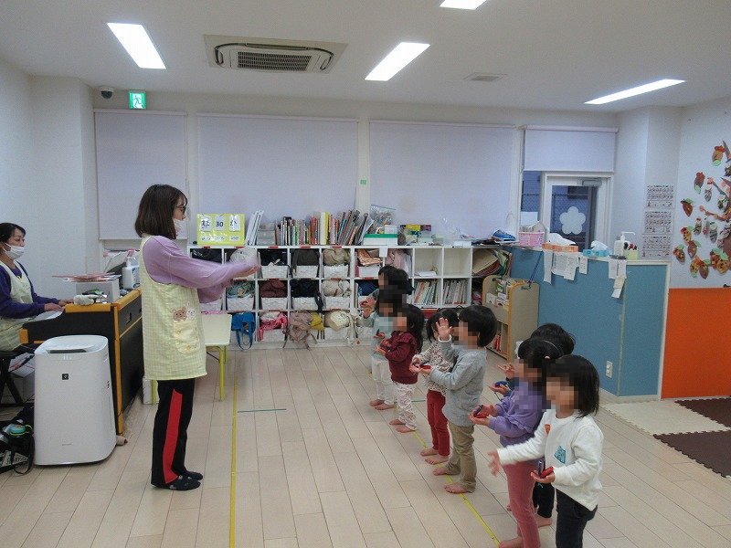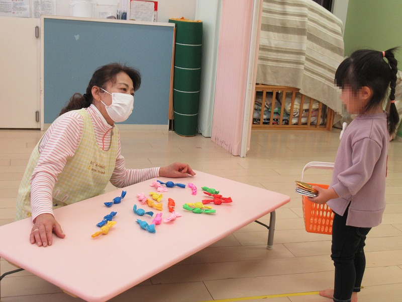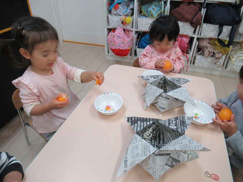 下の写真はみかんの皮むき(食育)とお買い物ごっこ(数字遊び)♪楽しく頑張りました(^o^)/