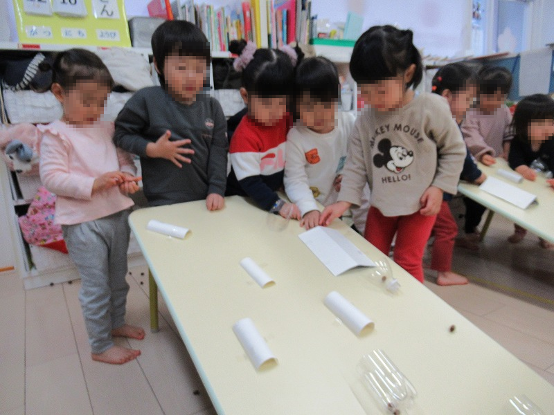 写真はドングリ転がし、まっすぐ転がらないドングリに子天使ちゃんたち興味深々(笑)。