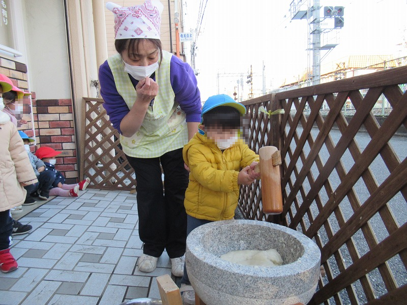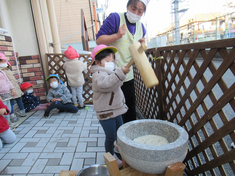 一人ずつ順番にお餅をついていきます。はぁーペッタン♪ペッタン・・がんばれー!(^-^)。