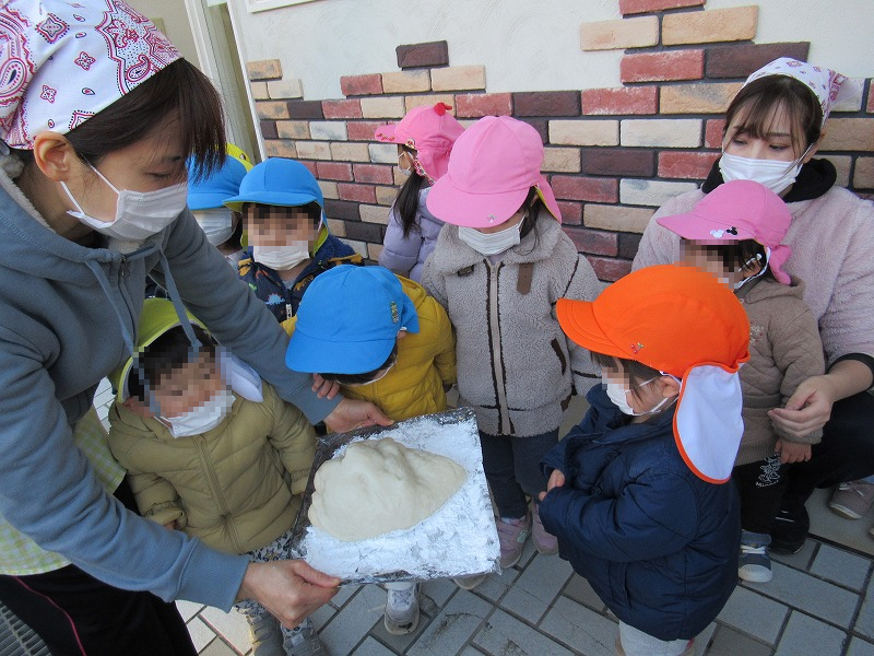 つきあがったお餅を見つめる子天使ちゃん達、「臼に入れるときはお米だったのに〜」(^-^)。