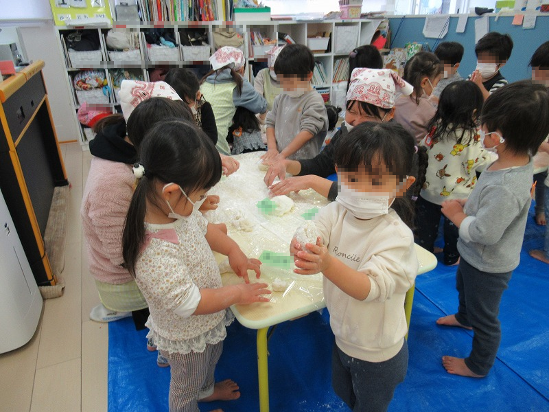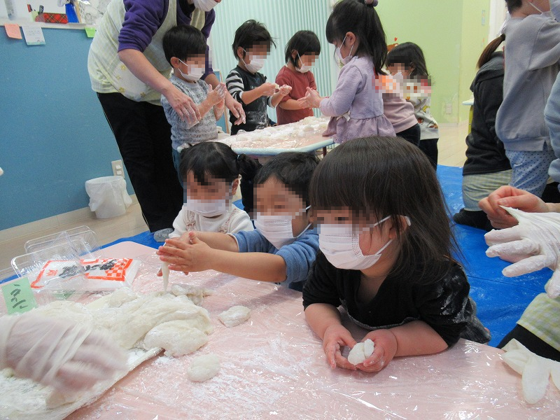 「つきたてのお餅、いい匂いのする温かい粘土みたい〜♪」一つ一つの工程をすべて遊びに変えちゃう子天使ちゃん達(笑)。楽しそう♪