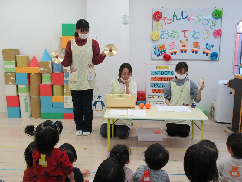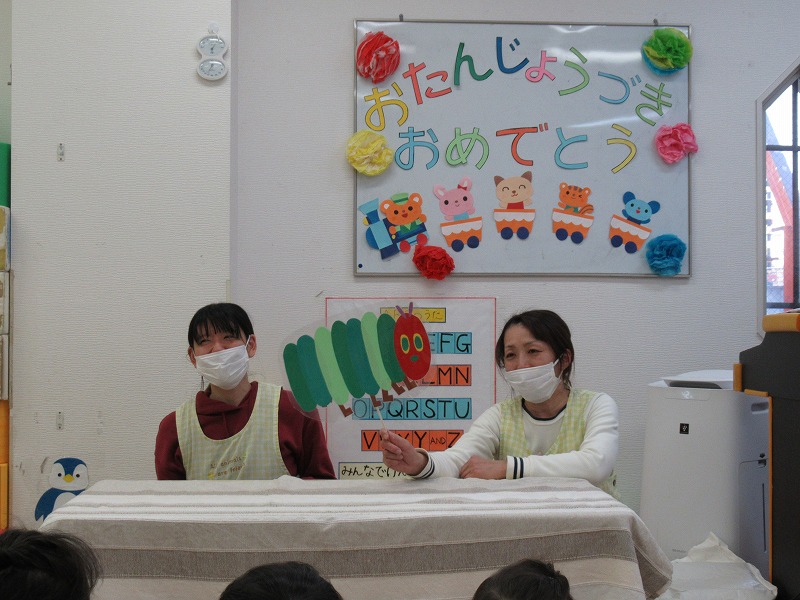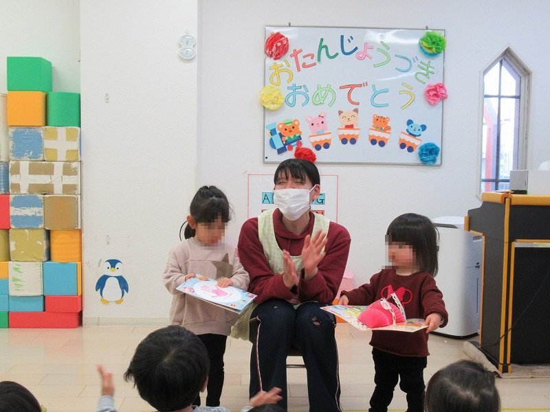 この日はお誕生月会をしました。最近すごく活発になってきた笑顔の可愛いSちゃんは満3歳♪年長園児に混じって遊ぶのがブームな、こちらも笑顔が可愛いRちゃんは満2歳♪