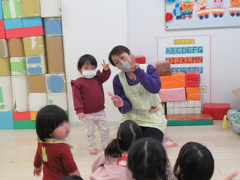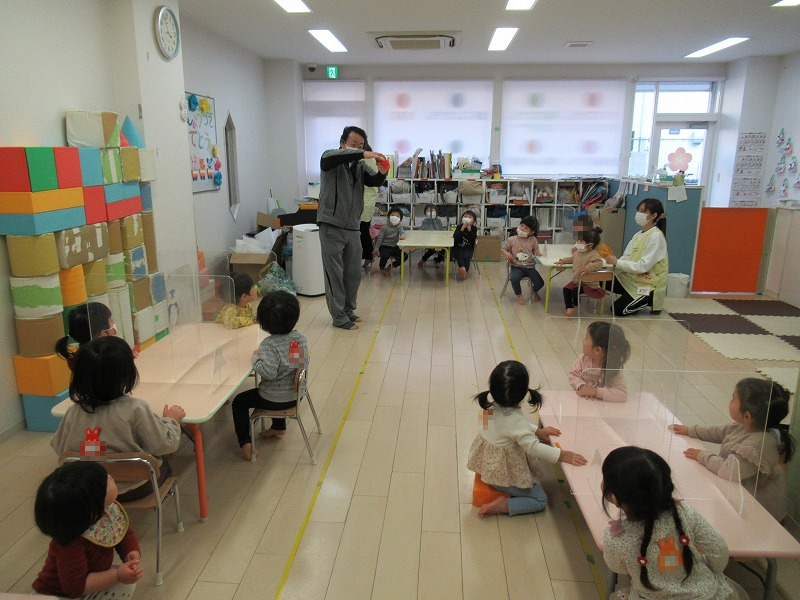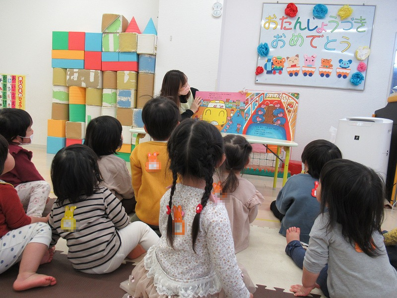 今日は2月生まれのHちゃん満3歳のお誕生月会♪先生達の出しものの後で、バースデーカードのプレゼントを受け取ったら、皆でお歌のプレゼント♪。手作りケーキと牛乳でカンパーイ(^o^)/。